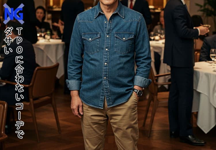 襟がある=きちんとしている、シャツだからオフィスでもいけるだろう――こうした素朴な判断でTPOを見誤ってしまうのが、ファッションに自信のない男性によくある傾向です。しかもデニムシャツは、色や生地感によって「フォーマルっぽく見える」勘違いが起きやすいのです。
