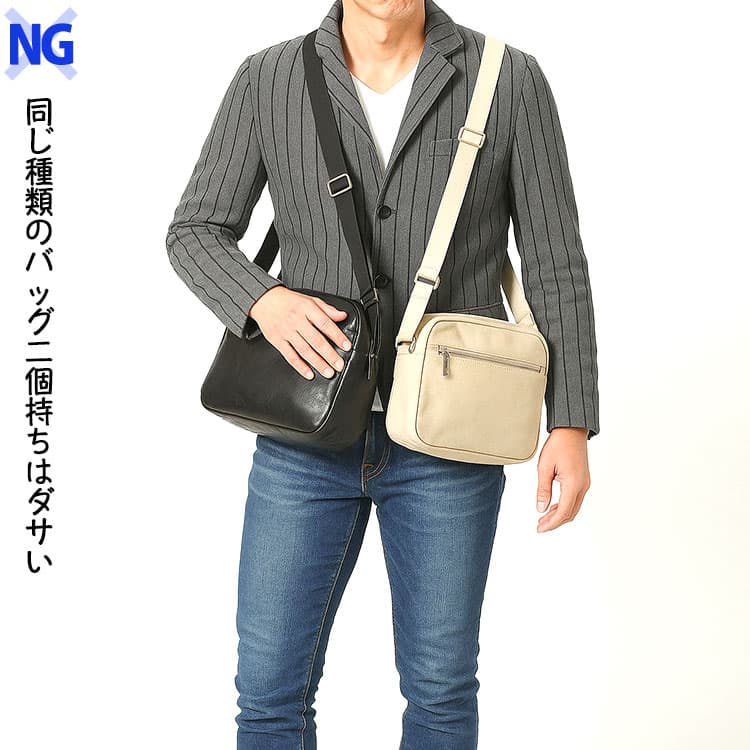ショルダーバッグとショルダーバッグ、など同じ種類のバッグの二個持ちはダサく見えてしまいます。