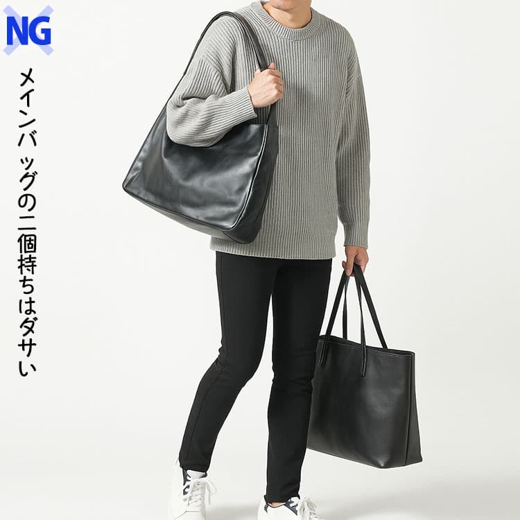 ショルダーバッグとショルダーバッグ、トートバッグとトートバッグなど、同じ種類のバッグ二個持ちはダサく見えます。