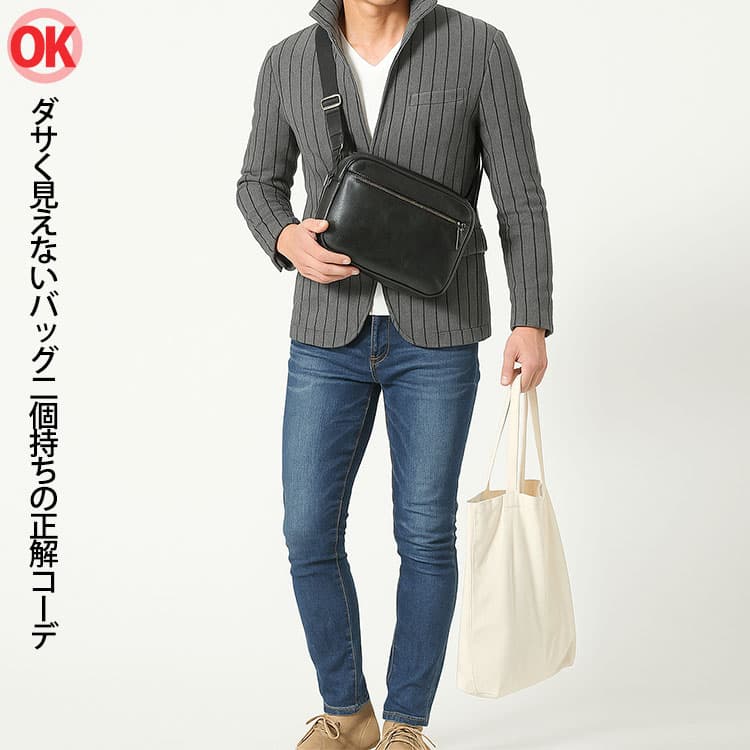 どちらもメインのバッグを持つと、バッグが悪目立ちしてしまい、ダサいコーディネートになってしまいます。