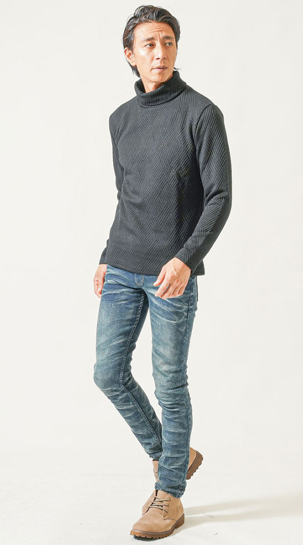 立体感ある素材のタートルニットと淡色スキニーデニムでメリハリの効いたシルエットに。