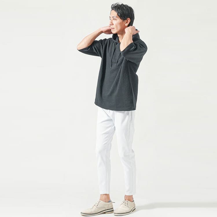 黒パーカーと白パンツを色でメリハリが生まれ、清潔感のあるパーカーコーディネートが完成します。