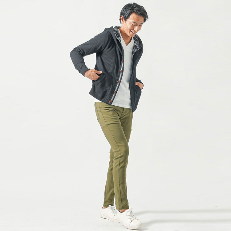 細身のチノパンを合わせることで男らしさはそのままに、清潔感が漂う黒パーカーコーデに。