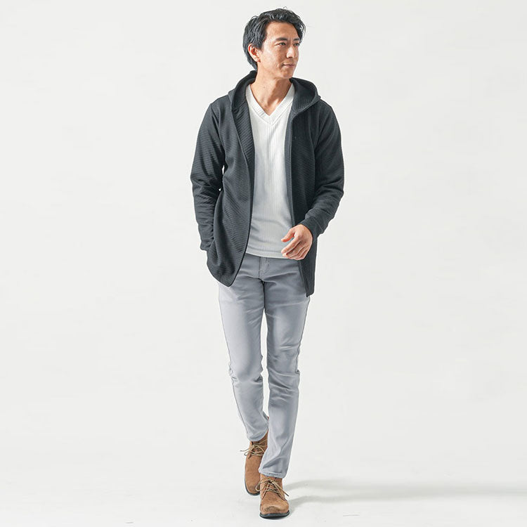 40代メンズ3点コーデセット 黒長袖パーカー×白長袖Tシャツ×グレーストレッチテーパードチノパンツ