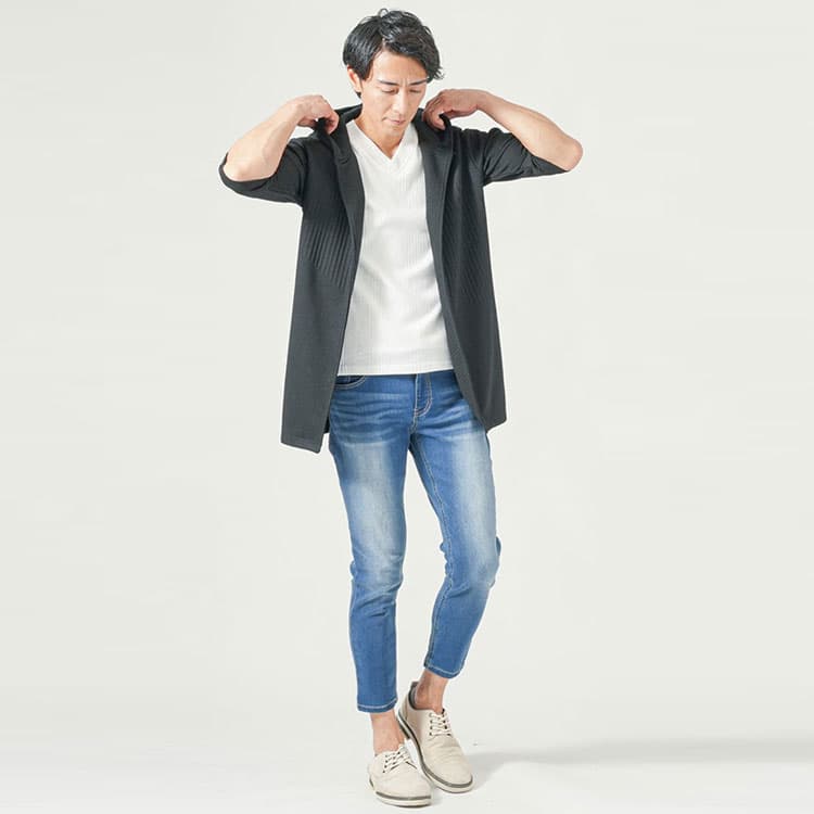 細身パンツと合わせることで腰回り〜裾にかけて自然にラインを出せるため、清潔感・スマートさを演出できるんです。