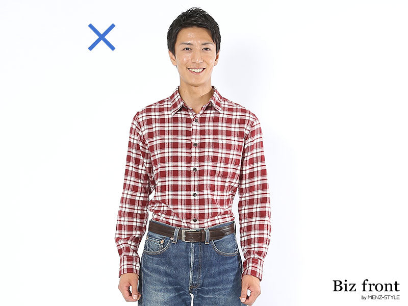 シャツインは、お腹まわりやウエストラインを隠すことができないどころか、むしろそこを目立たせてしまいやすい着こなしです。特にお腹が出ている場合、シャツが前に引っ張られてピンと張り、おなかの丸みが強調されてしまいます。さらにベルトが食い込むと、その境目に視線が集中しやすく、「頑張ってるけどちょっと無理してる感」が出てしまいがちです。