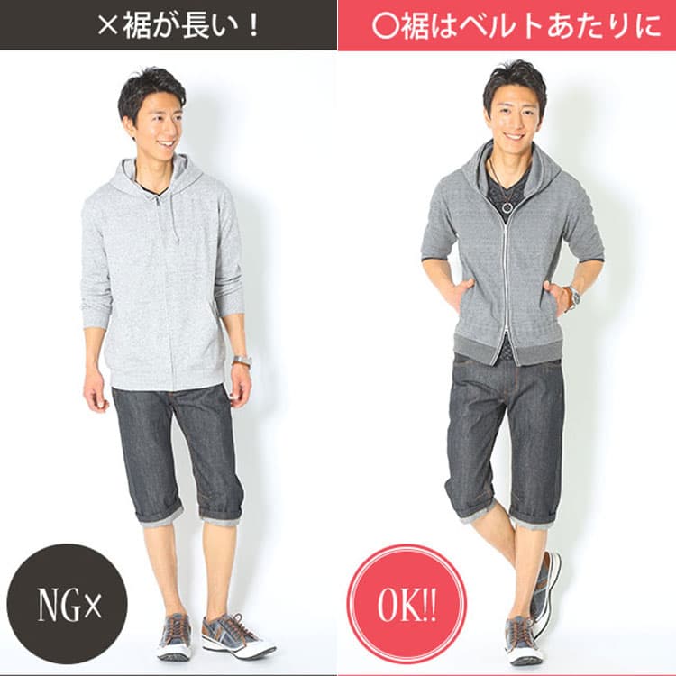 右のトップス短めのパーカーを合わせたコーデのほうが脚が長く見えますよね。