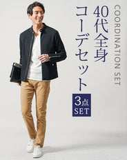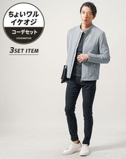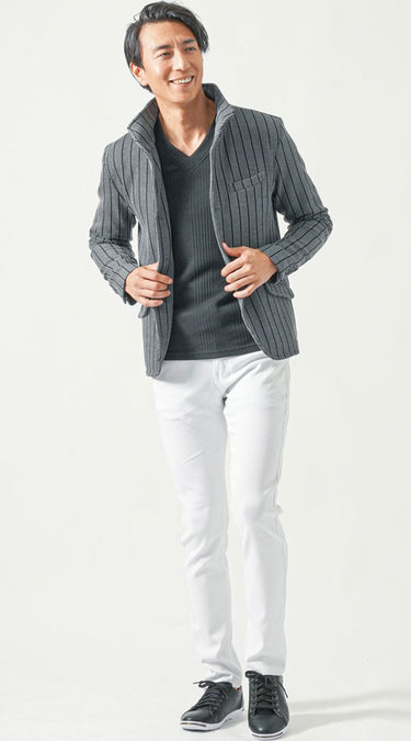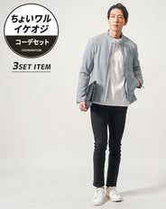 50代メンズ全身3点コーデセット グレー長袖ジャケット×黒長袖Tシャツ×白ストレッチチノパンツ