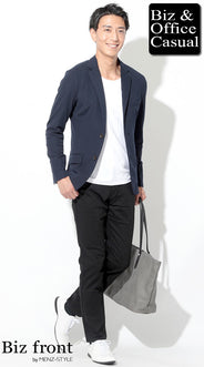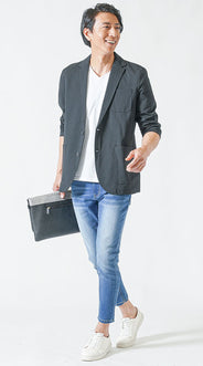 細身に作られたジャケットなら“あえてスニーカーを合わせた”おしゃれな印象のコーディネートに仕上がります。