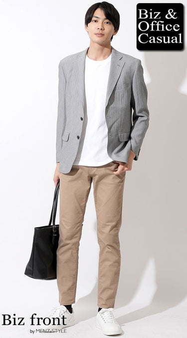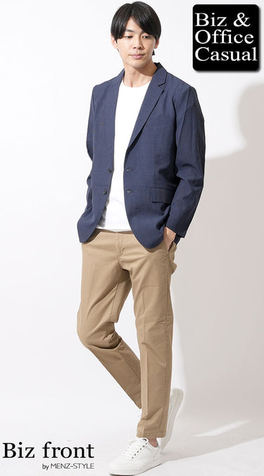 セットアップ感を避け、“カジュアル要素を含んだジャケット&パンツ”を意識して選びましょう。たとえば、ウールよりコットンやポリエステル混、パリッとしすぎない表面感のある素材に。パンツもノープレス・テーパードなど、軽やかなシルエットのものを選ぶことで、スニーカーとの馴染みが良くなります。