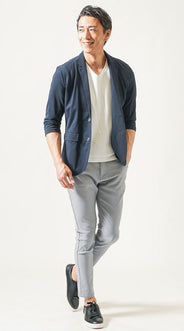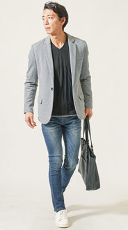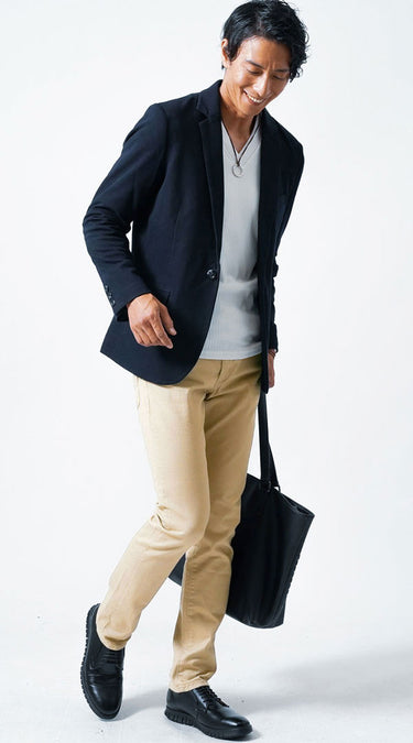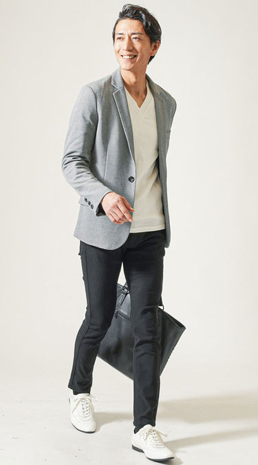 40代メンズ春服全身3点コーデセット グレーテーラードジャケット×白Vネック長袖Tシャツ×黒スリムチノパンツ