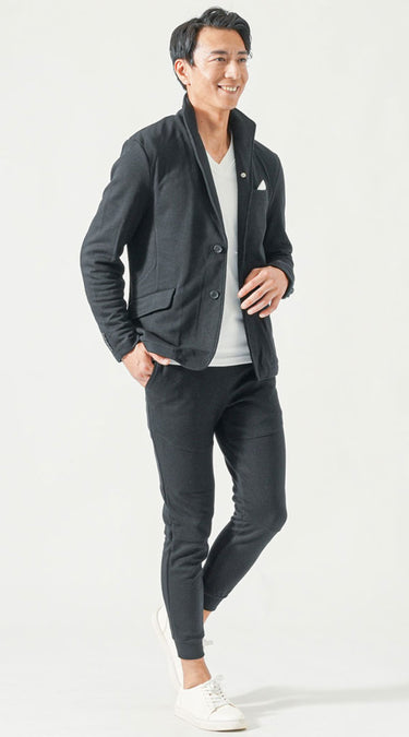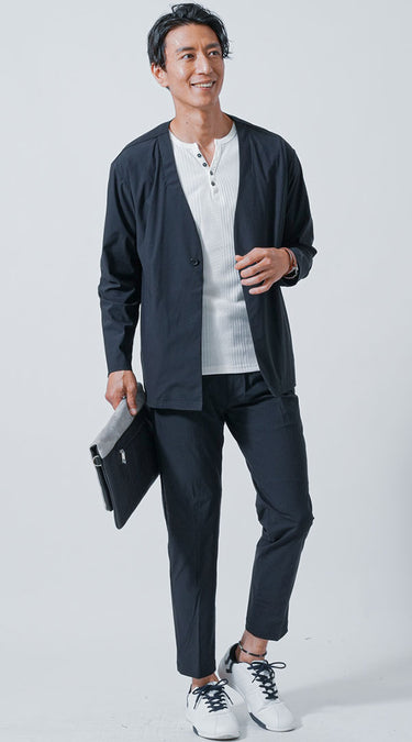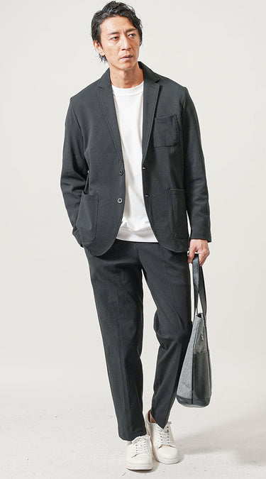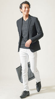 40代メンズ秋服全身3点コーデセット 黒テーラードジャケット×黒ジャガードVネックTシャツ×白テーパードパンツ