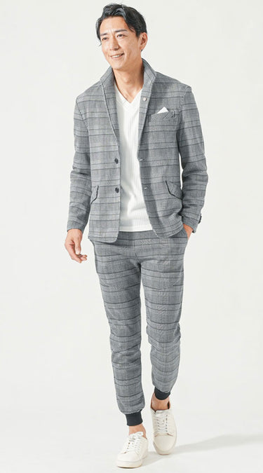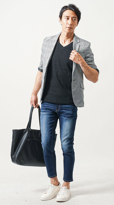 モノトーンで統一した着こなしは、グレンチェックのテーラードジャケットがさりげないアクセントとしておしゃれさを引き立てます。