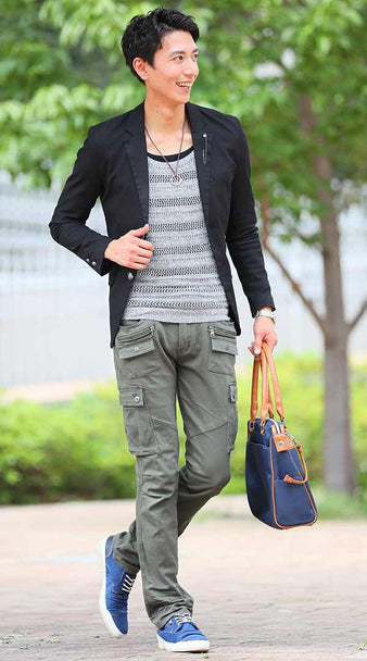 ジャケット×スニーカー×グレーメッシュニット×カーキカーゴパンツ