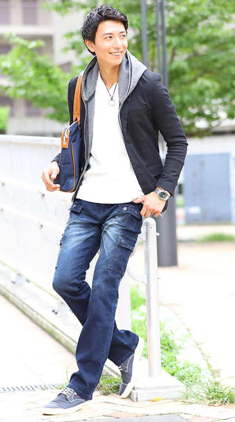 ジャケット×スニーカー×グレーパーカー×デニムカーゴパンツ