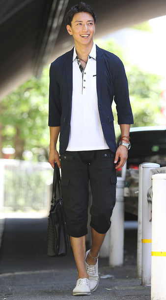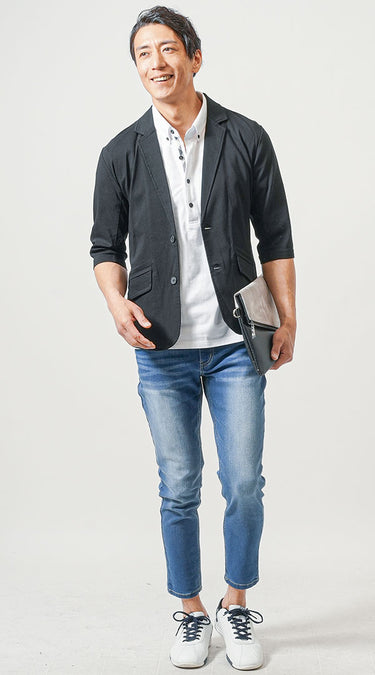 ジャケット×スニーカー×白ポロシャツ×黒クロップドパンツ