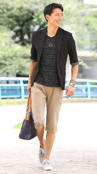ジャケット×スニーカー×ブラックジャガードデザインカットソー×ベージュクロップドパンツ
