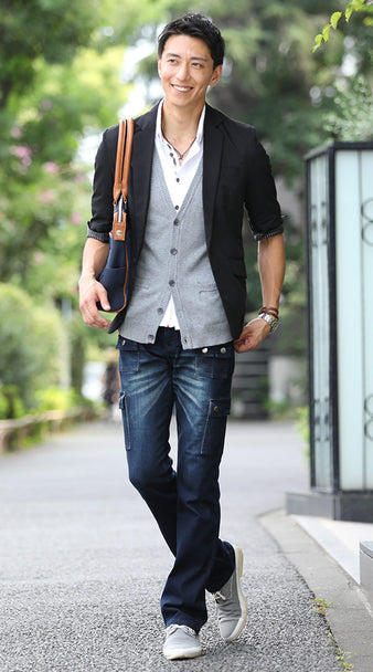 ジャケット×スニーカー×白シャツ×グレーカーディガン×デニムカーゴパンツ