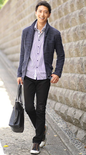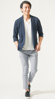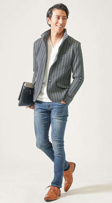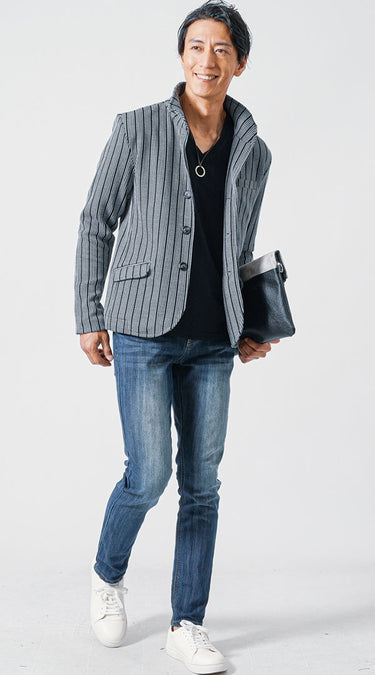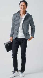 イタリアンカラージャケットにストライプシャツを合わせた上品なコーデは、黒スキニーパンツでメリハリをつけることで男らしい雰囲気を与えます。