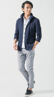 “仕事用のジャケットやパンツをそのまま私服に使いまわす”という男性は多く、そこにスニーカーを合わせて「オフっぽく崩したつもり」が逆効果になっているパターンです。本人は“うまく着崩してるつもり”でも、素材感の不統一が目立ち、野暮ったさが前に出てしまいます。