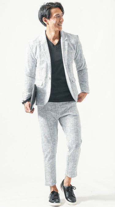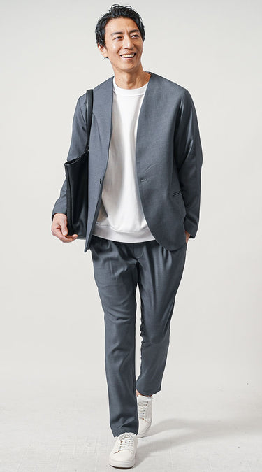 セットアップのジャケパンスタイルには白やライトグレーなど明るい色のスニーカーがおすすめです。