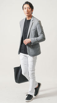 ちょいワル・イケオジメンズ3点コーデセット グレー長袖テーラードジャケット×黒長袖Tシャツ×白スリムチノパンツ