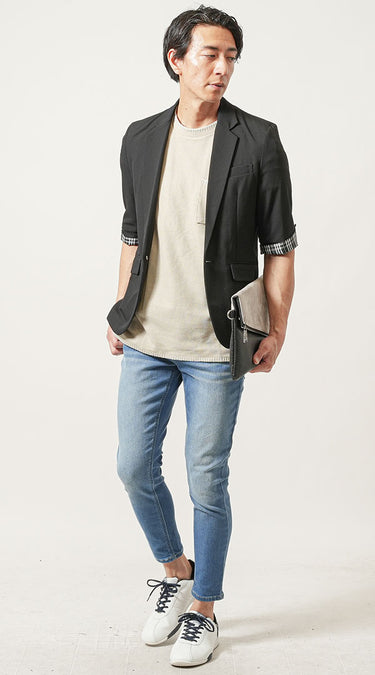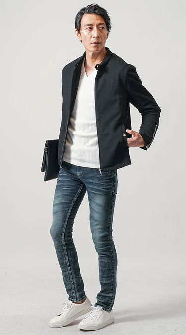 ジャケット×スニーカー×白シャツ×黒スキニーパンツ