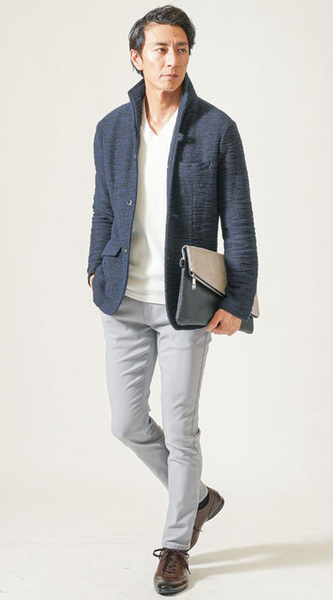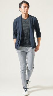 グレーメッシュニットにネイビーテーラードジャケットを合わせる事で、洗練された大人の雰囲気を作ります。
