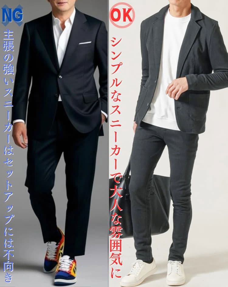 その違和感の正体は、派手すぎるスニーカーやビジネス寄りすぎるジャケパン、小物選びのズレといった“ちょっとしたミスマッチ”でした。
