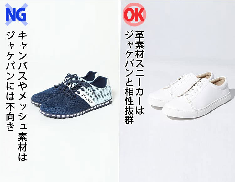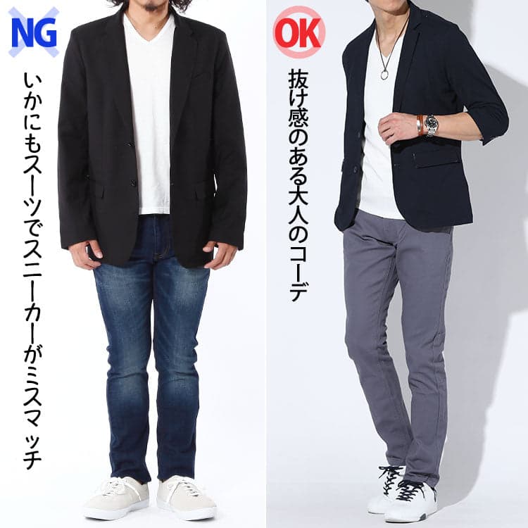 パンツのセンタープレスがビシッと入っていたり、ジャケットの素材が艶ありウールだったり…。このように“スーツのようにカッチリしすぎたジャケパン”にスニーカーを合わせると、フォーマルとカジュアルが衝突して、ちぐはぐで中途半端な印象になります。