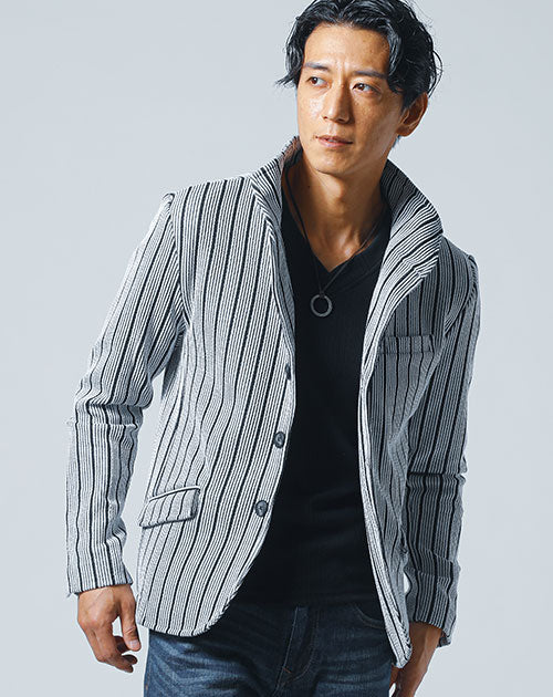 白ジャケット特有の「太って見える」「着膨れする」といった悩みを軽減するのが、この縦ストライプ柄のスタンドカラージャケット。