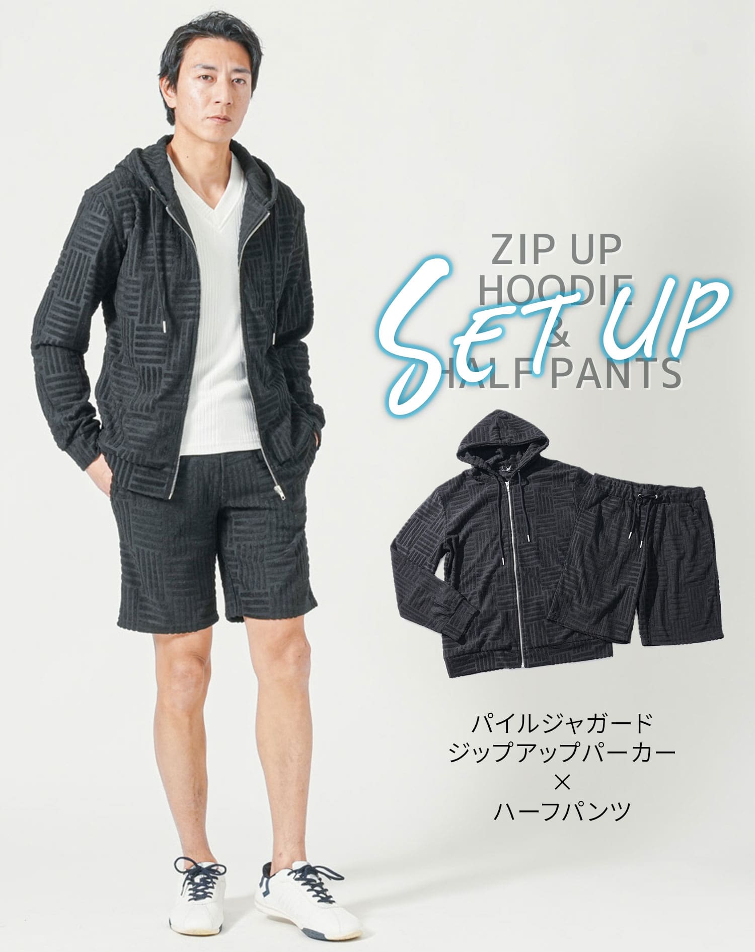 総柄セットアップ パイルジャガード長袖ジップアップパーカー×ハーフパンツ