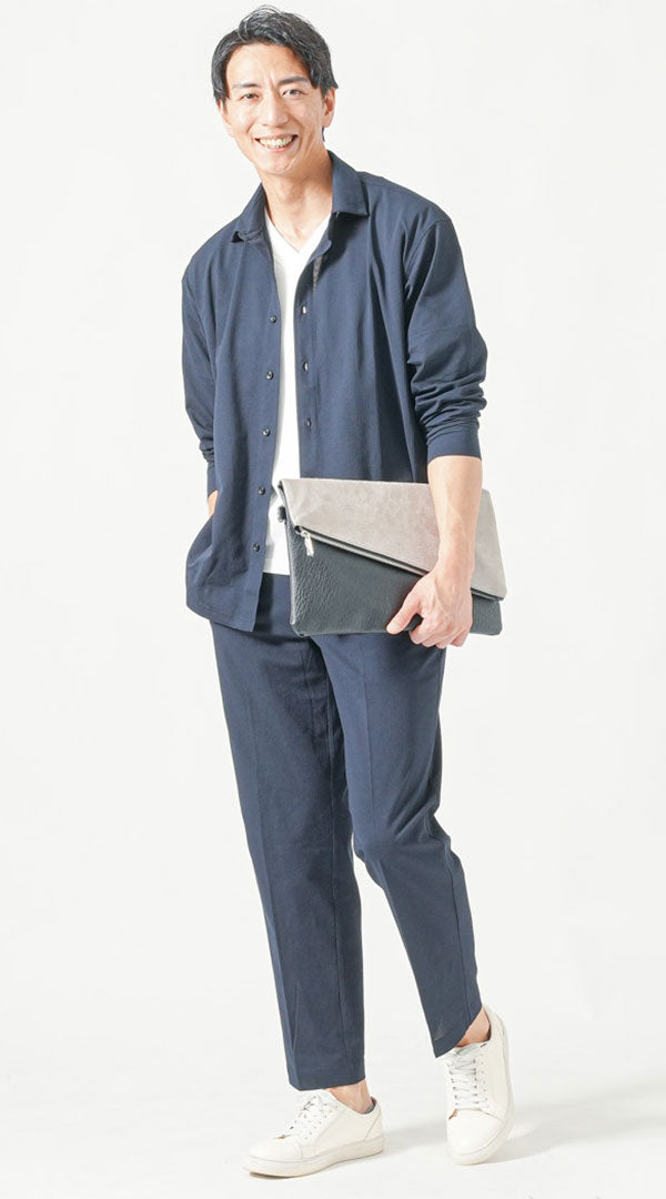 シャツとパンツをネイビーで統一し、全体の印象を一本化したセットアップスタイル。白のインナーとスニーカーが適度な抜け感をつくり、重くなりがちなネイビーを軽やかに見せています。色の主役を「ネイビー」と決めることで、シンプルながら洗練された印象に。色の組み合わせに悩んだときは、このように1色を軸にすると、誰でもバランスの取れた大人のコーディネートが完成します。
