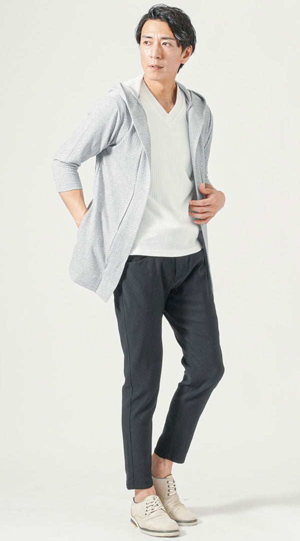 白のTシャツにライトグレーの7分袖パーカーを重ね、黒のテーパードパンツで引き締めたモノトーンコーデ。色数を増やさず白・グレー・黒の3色で構成することで、清潔感とスマートさを両立。全体の配色にしっかり統一感があります。「色の組み合わせで失敗したくない」と感じる大人男性にこそ取り入れてほしい、シンプルなのに印象が良いお手本スタイルです。