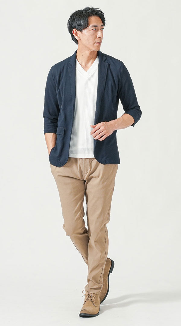 マッチングアプリ婚活初対面デート服メンズ3点コーデセット ネイビー鹿の子テーラードジャケット×白Vネック7分袖Tシャツ×グレースキニーストレッチパンツ
