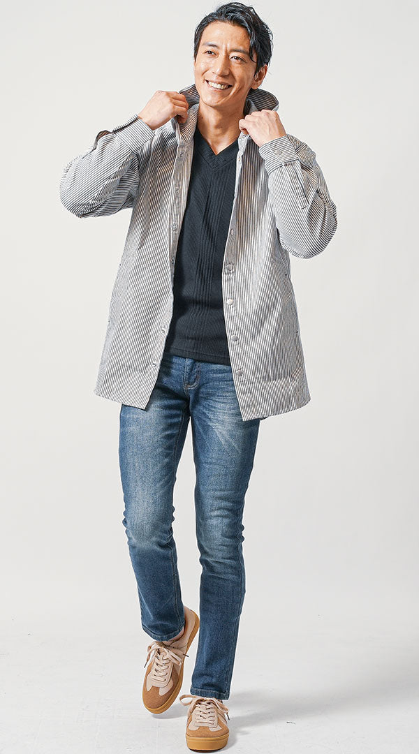 白黒ストライプのシャツパーカーに黒Tシャツとデニムを合わせた、モノトーン+ブルーでまとめたカジュアルコーデ。足元にはキャメル系のスニーカーを差し色として取り入れ、ベーシックな配色に程よいアクセントをプラスしています。色数を抑えつつも、やや明るめの色を小面積で効かせることで、こなれた印象に。大人のカジュアルコーデでは、こうした控えめな差し色がバランスよく映えます。