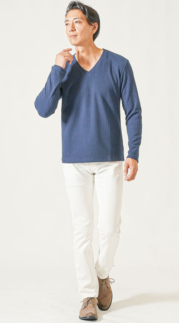 リブ素材のネイビーニットに白パンツを合わせた、上品かつ爽やかな夏仕様の清潔感スタイル。ネイビーの落ち着きが顔まわりに信頼感を与え、白パンツで軽さと清潔さをプラス。40代の大人だからこそ映える控えめなVネックが、涼しげかつ誠実な印象を与えてくれます。キメすぎないのにきちんと見える、季節感のあるスタイリングです。