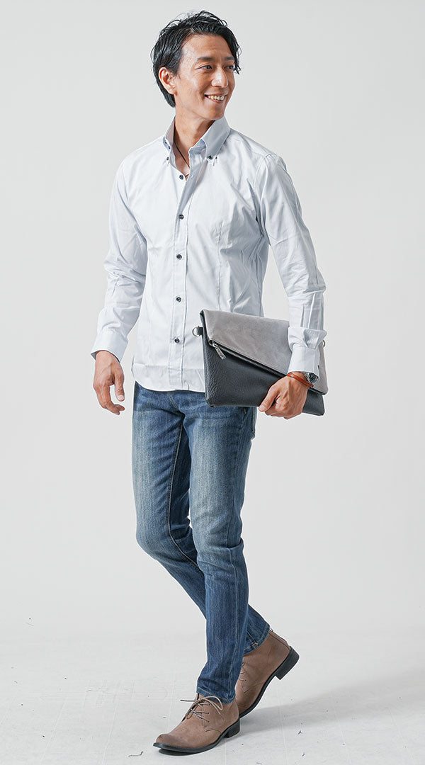 肩の傾斜が目立ちやすいなで肩体型において、シャツ選びで重要なのが「襟の立体構造」。このコーデではボタンダウンシャツを使用し、襟がしっかりと立ち上がることで肩から首のラインを直線的に整え、上半身のバランスを補正しています。さらに、シャツの縦ラインとボタン配置による視線誘導により、なで肩特有の丸みを軽減。シンプルながらも構造的に似合わせた好印象スタイルで、ビジネスシーンから大人の外出まで幅広く活躍します。