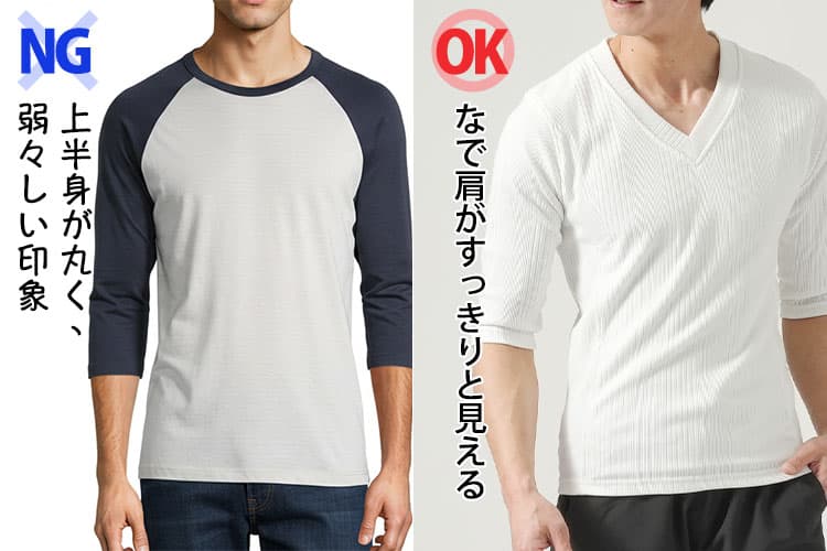 ラグランスリーブTシャツは肩が沈んで貧相に見える
