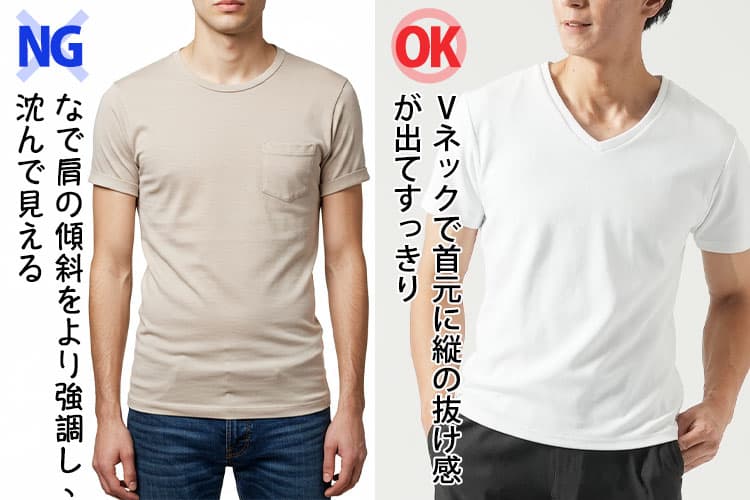 Tシャツやニットはネックの形と素材選びの両方から整えていくことが重要です。Vネックやヘンリーネックなど、首元に縦の抜け感があるデザインは、顔まわりをシャープに見せると同時に、肩との境界線をぼかしてくれます。