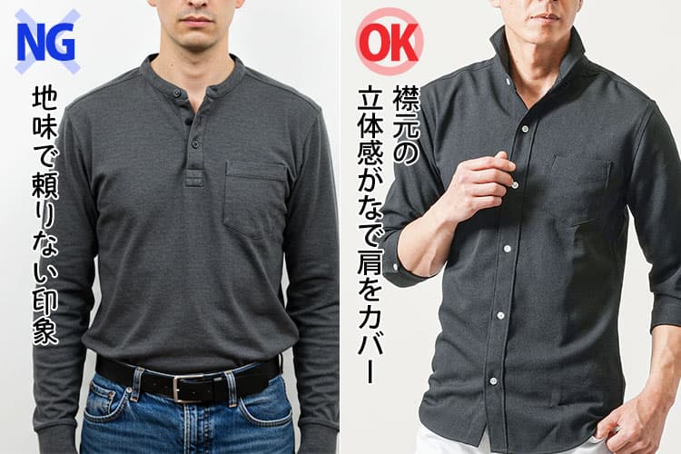 シャツでは、ボタンダウンカラーやワイドスプレッドなど、襟に立体感があり、視線を顔まわりに集めやすいデザインが効果的です。逆に、ノーカラーやバンドカラーのような“抜けすぎる襟”は、肩の落ち感を強調するため、避けた方がよいでしょう。