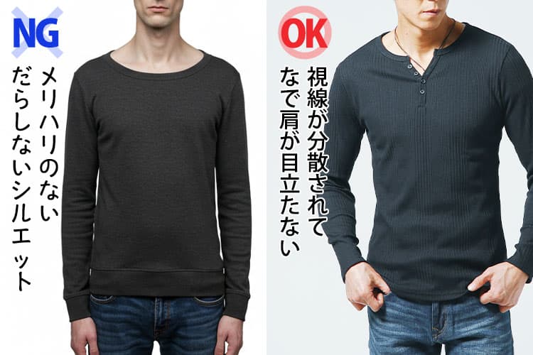 ニットであれば、リブがしっかり入っているクルーネックや、やや高さのあるハイネックを選ぶと、首まわりに存在感が生まれ、肩との高低差をカバーしやすくなります。