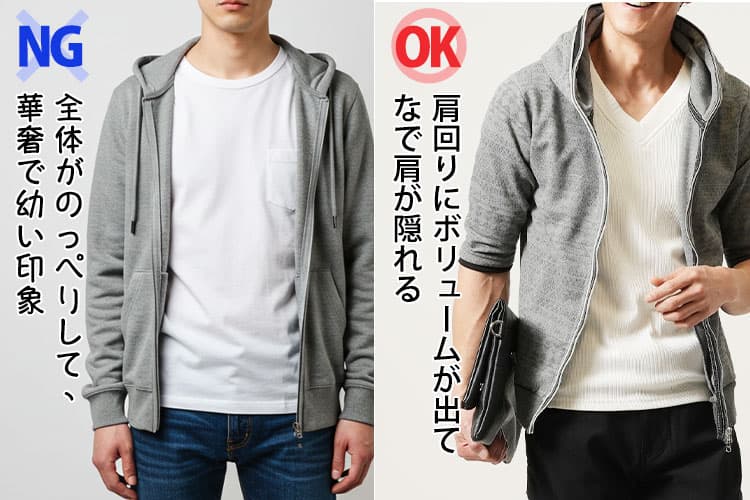 フードが立たずにぺたんと倒れてしまうパーカーは、肩から首にかけての高さがなくなり、なで肩特有の沈み込みが悪目立ちします。全体がのっぺりして、華奢で幼い印象に見えてしまう危険性が高いアイテムです。