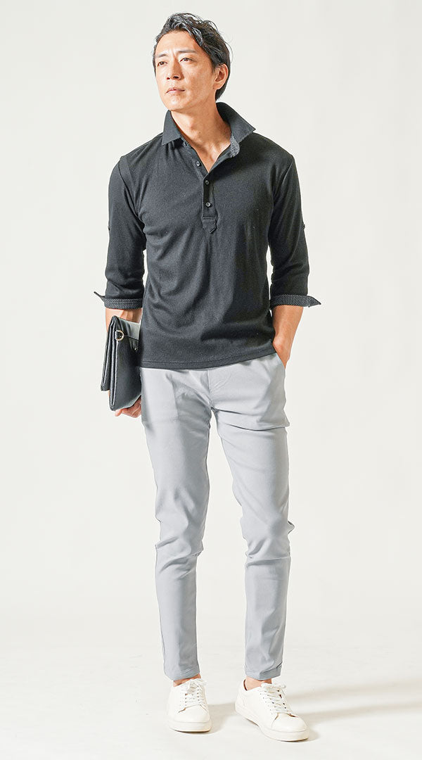 黒ポロシャツは着こなしを間違えると堅くなりすぎてしまいますが、ベージュのスリムパンツを合わせれば、やさしさと親しみやすさを演出できます。