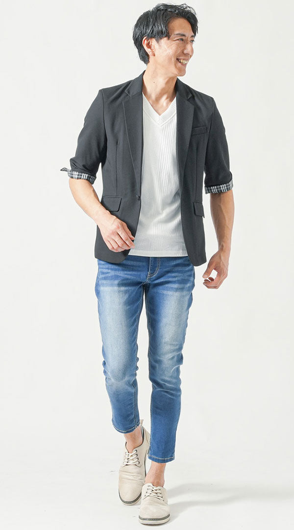 40代メンズ夏服全身3点コーデセット 黒5分袖テーラードジャケット×白半袖ポロシャツ×ブルーアンクルデニムパンツ
