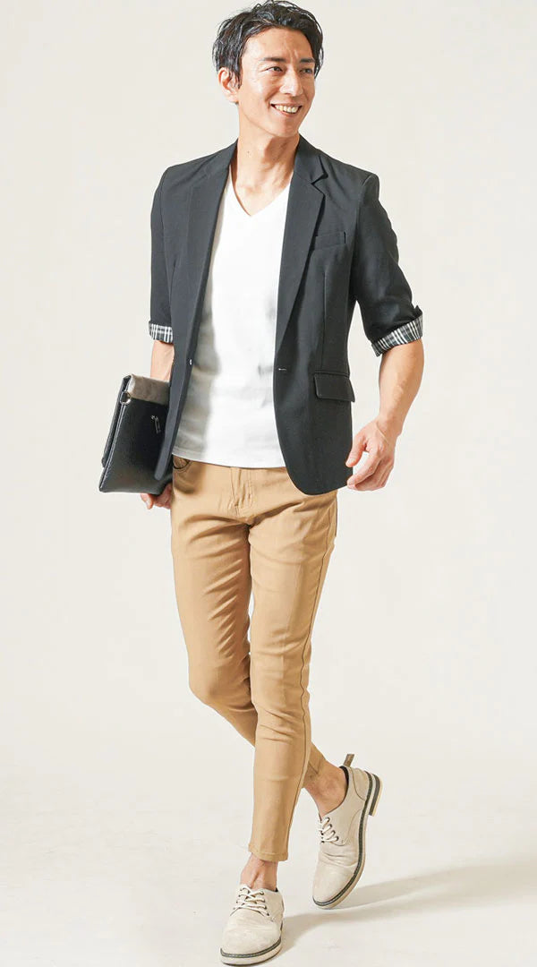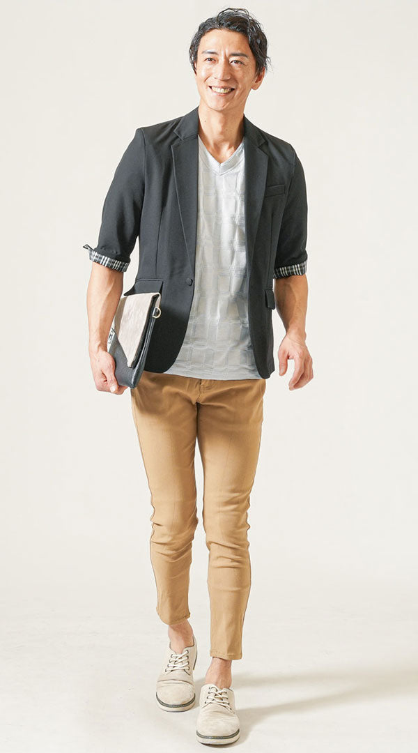 50代メンズ夏服3点コーデセット 黒5分袖テーラードジャケット×白半袖Tシャツ×ベージュアンクルチノパンツ