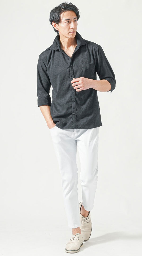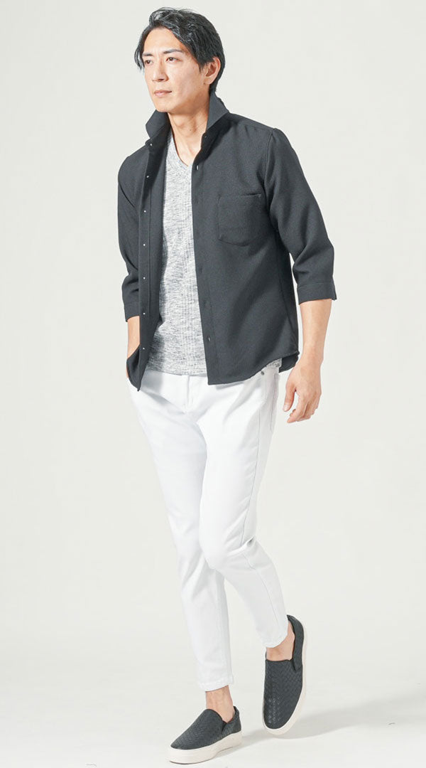 黒シャツの引き締まった印象を活かしながら、白パンツを合わせることで爽やかさと抜け感を加えた好バランスのモノトーンコーデです。