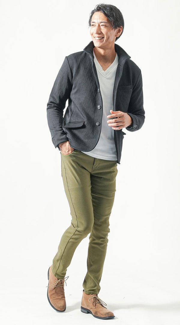黒の立ち襟ジャケットにカーキの細身パンツを合わせることで、落ち着いた印象にほどよい抜け感を加えた大人のきれいめコーデに仕上がっています。