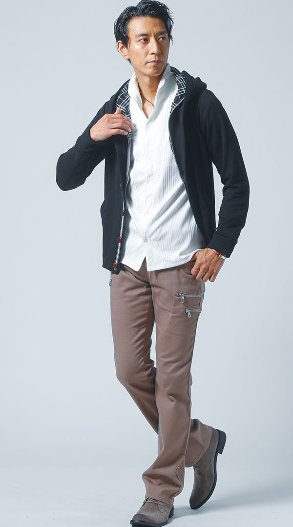 - 黒の服に合う色のズボンと合わせたメンズコーデが分かる