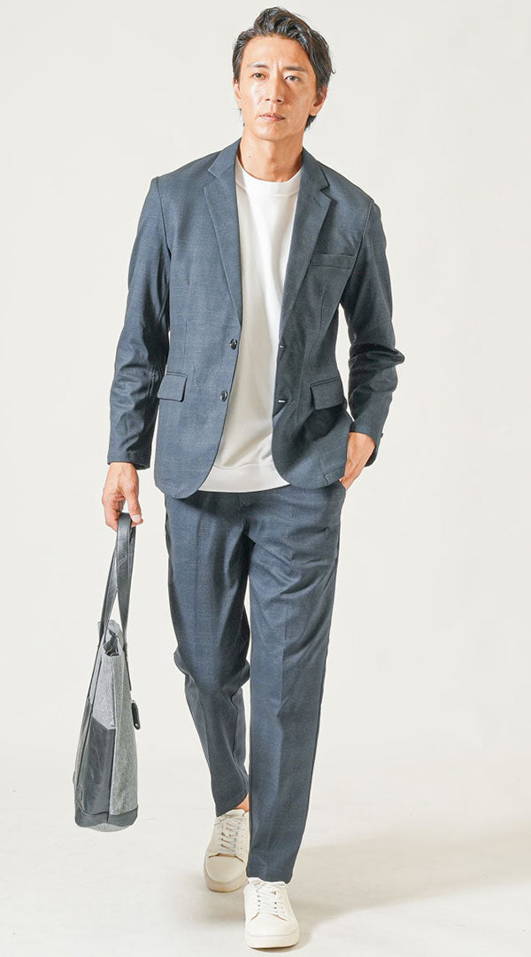 グレーのセットアップは、縦のラインを強調するのに最適な高身長向けアイテムです。ウエスト位置が自然に見えるようジャケットの丈とパンツの股上が設計されており、スタイルアップ効果も抜群。白のインナーとスニーカーで清潔感をプラスし、ビジカジにも休日にも対応できる万能な1着です。高身長の方が着ることで、セットアップの端正なシルエットが一層引き立ち、春らしい軽やかさと洗練を同時に叶えられます。